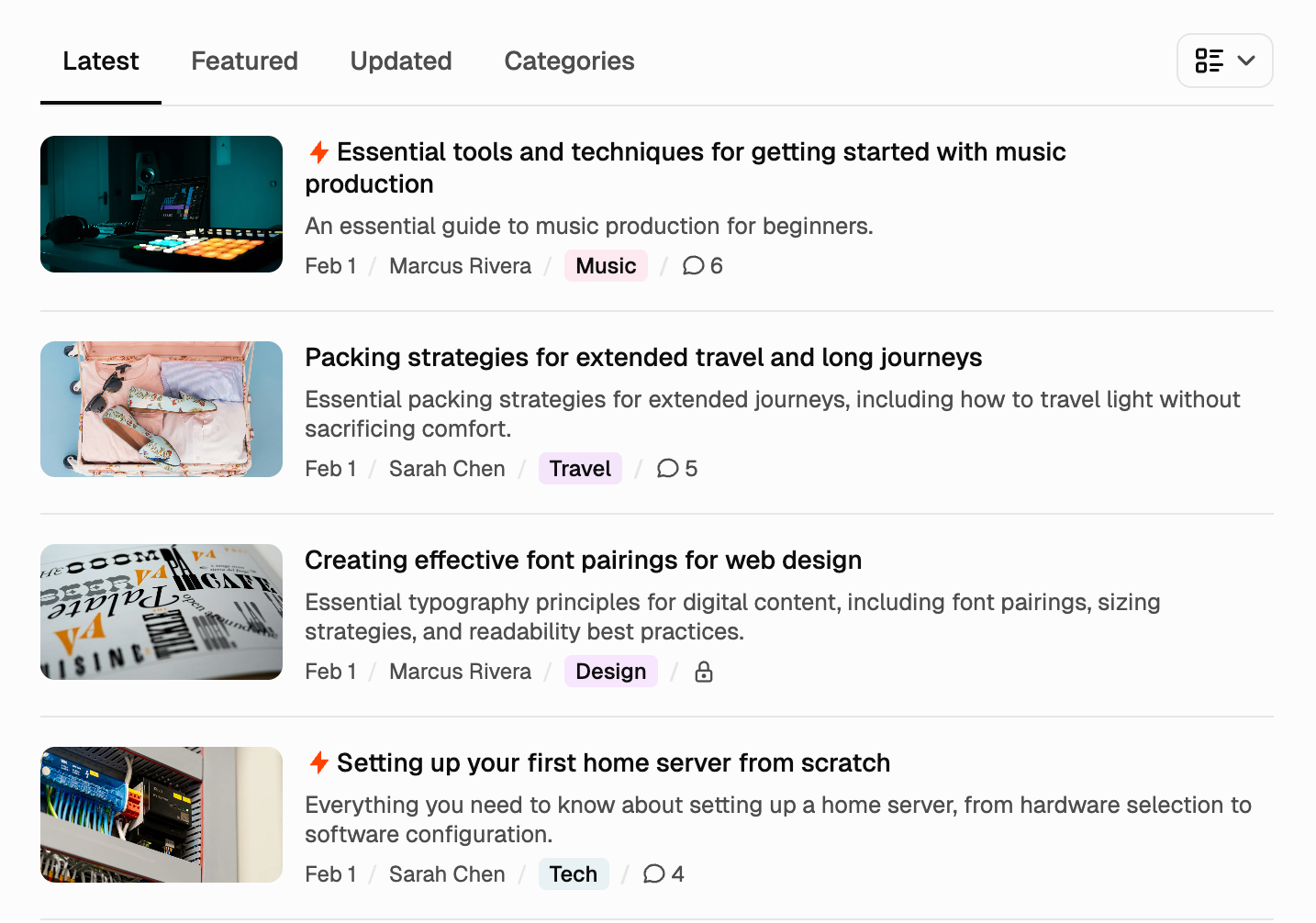 Not everyone browses the same way. Thred gives readers tabs for what to see (latest, featured, updated, by topic) and a control for how to see it—list, cards, or full articles—so scanners and deep readers both get the view they want.