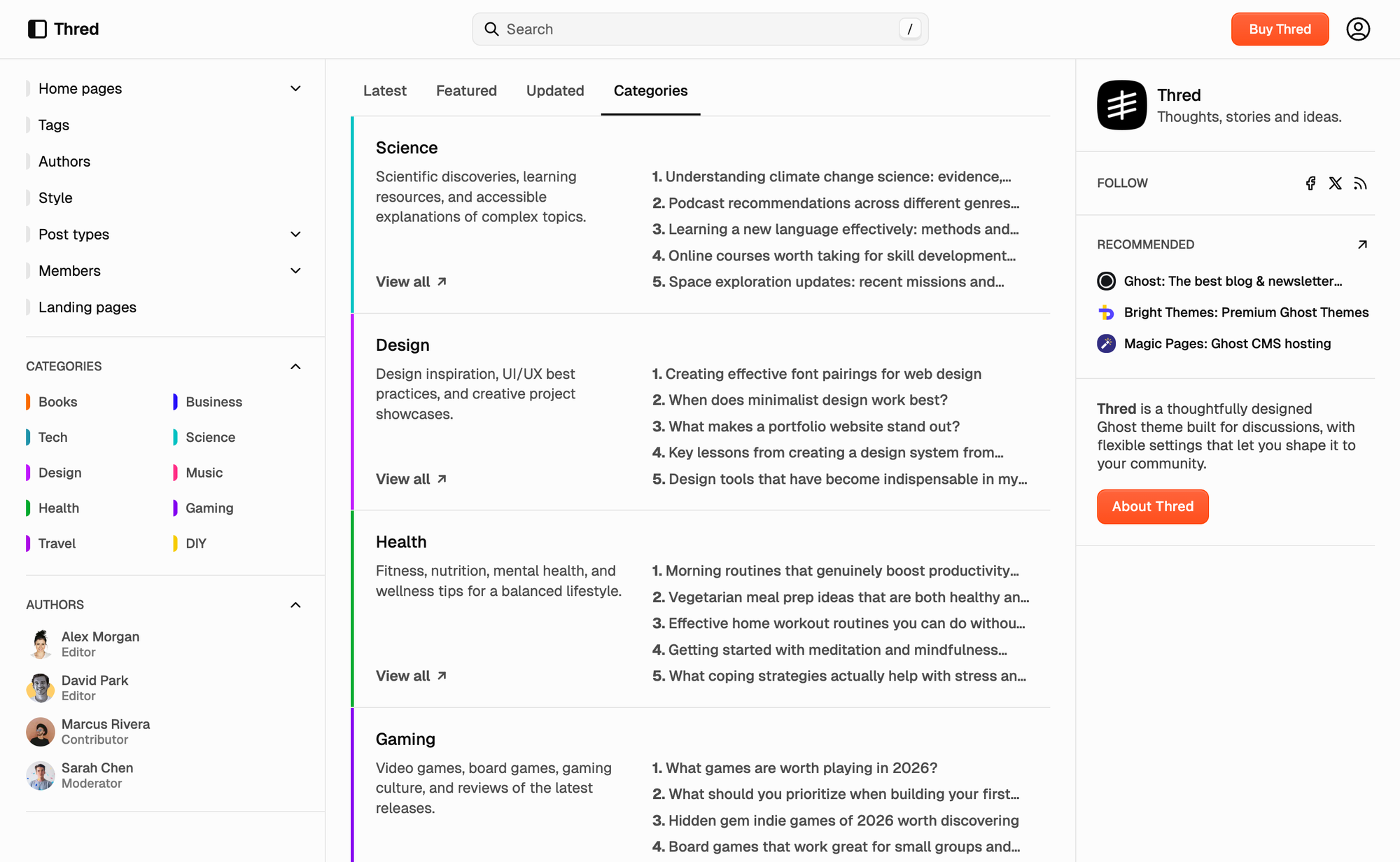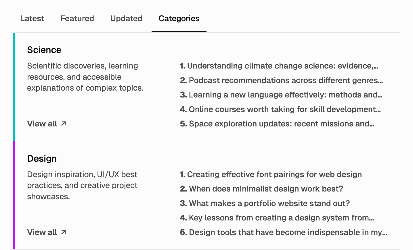 Topics are always within reach. The left sidebar has a dedicated categories area so readers can jump to a tag from anywhere. On the homepage, the categories tab turns your tags into topic sections—each with up to five posts—so the feed can be browsed by subject at a glance.
