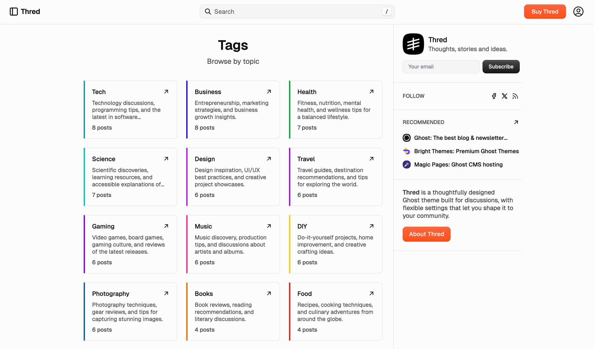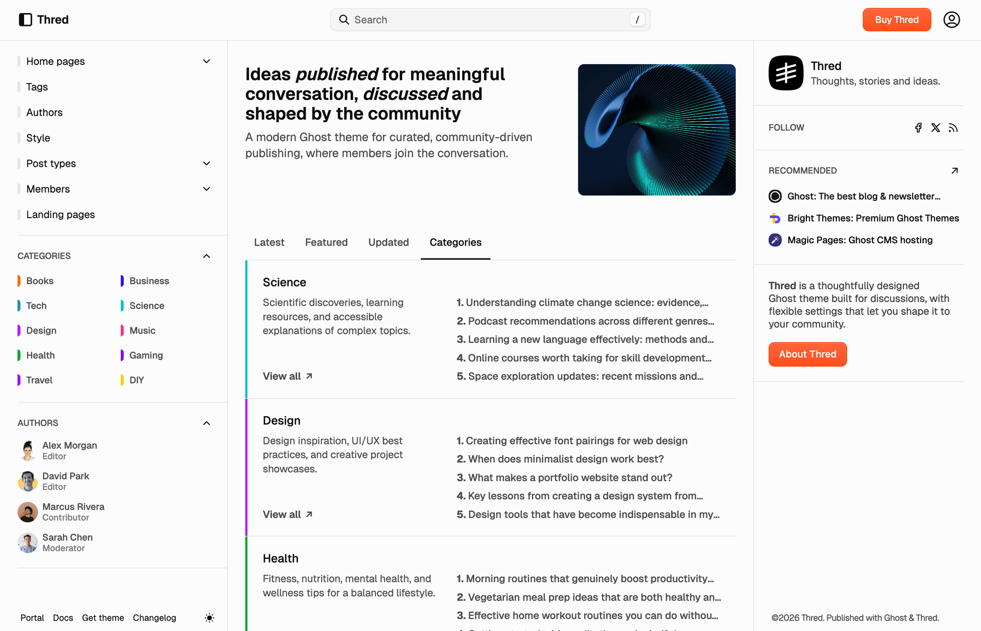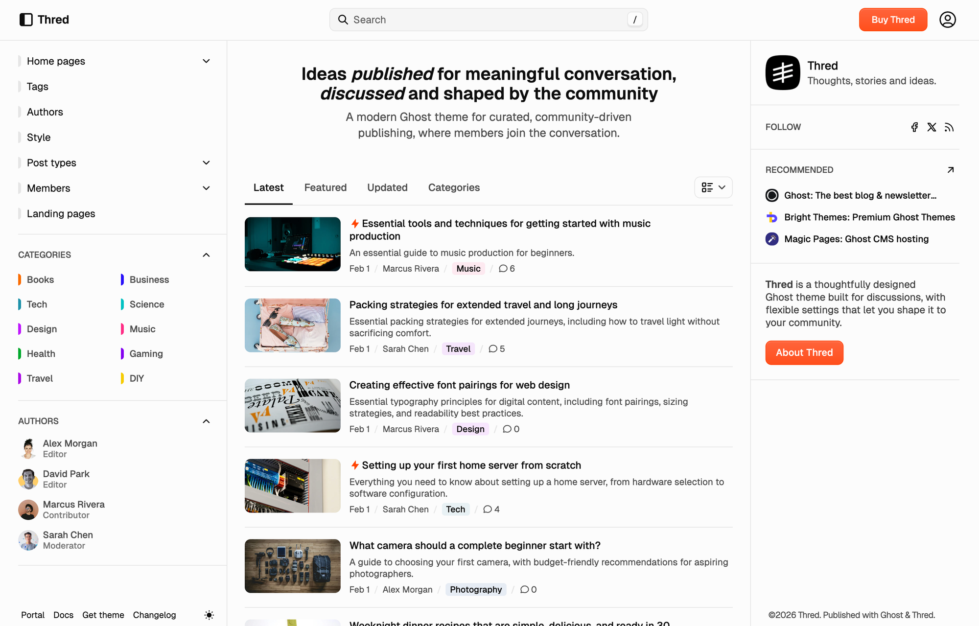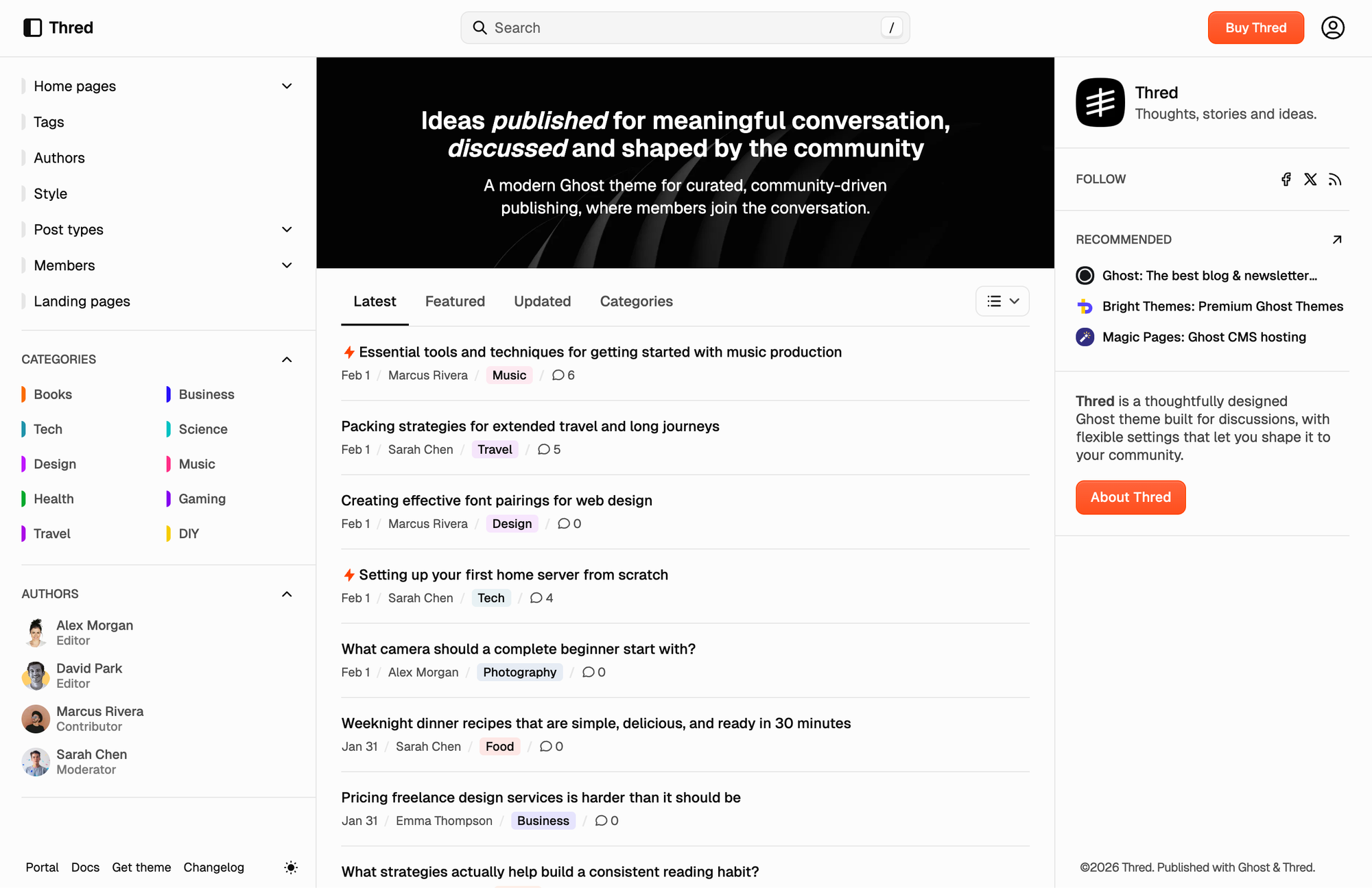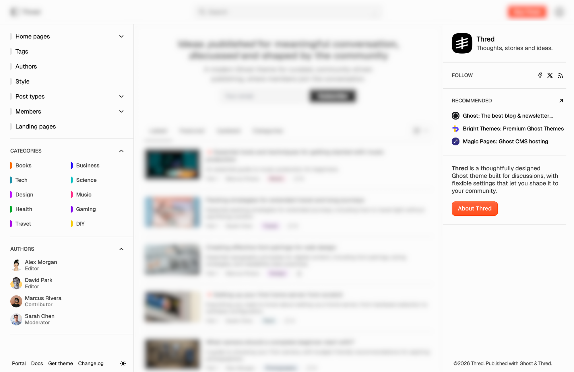 Forum-inspired structure, topic-based organization, and flexible feeds, and thoughtful typography keep context in view. Built for blogs, communities, and newsletters where discussion and discovery matter as much as the latest post.